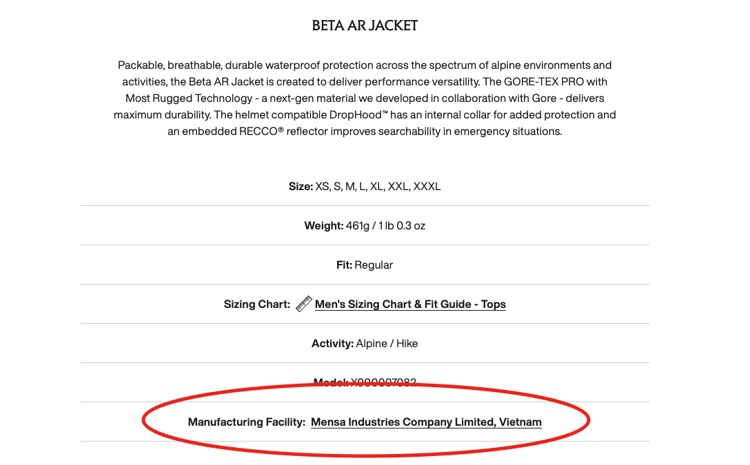 Kudos to Arc'teryx for its transparency around where each of its products is made. Every Arc'teryx product page, from jackets to pants to hats to gloves to packs, identifies which factory the product was made in: